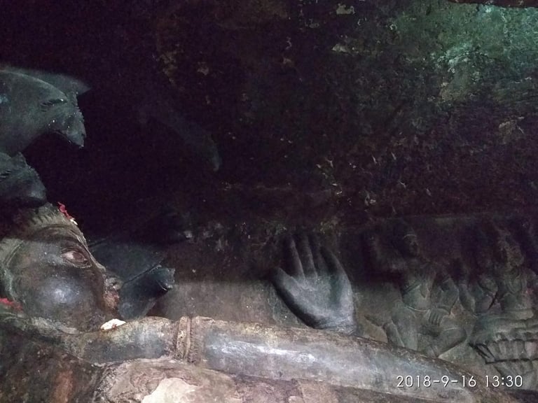 Sculptures on the walls represent Vaishnava deities. The second storey has a pillared rectangular shrine of Vishnu on a serpent. Sculptures of Shiva and Vaishnava and a few like the Vaishnava Alwars are sculptured later on. The top floor was unfinished with a Triple Shrine. Some of the sculptural specimens are attributed to Chalukyan period. It has 5 meter long statue of Vishnu in reclining position.However, it may be difficult to conclude that the 5 meter long statue is lord Vishnu, because well accepted position of lord Vishnu are one side aligned, closed eyes, four hands, 5 head serpent with female god Shre Devi and Bhudevi. There is no such similarity. So it can be concluded that the statue may be 23rd or 17th tirthankara of jainism Parshvanatha. More particularly, the 8 head serpent in the cave leading to a new topic of research in the respective field.